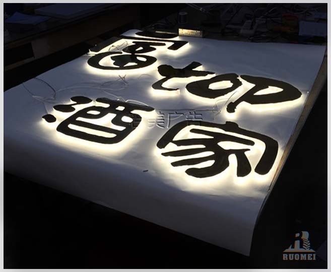 亞克力背光字的制作工藝比其他發(fā)光字制作要簡單些,首先是將字體的形狀雕刻出來,然后再根據(jù)光學原理設(shè)計布燈的燈槽,再將LED燈放入特定的燈槽中即可,最后根據(jù)不同需設(shè)計各種色彩的面板即可完成,這看似簡單的步驟制作起來卻不簡單,尤其在雕刻的細節(jié)的布燈方面。